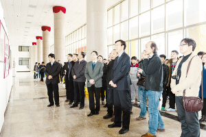 近日,由淮阳县政府、周口师院主办的“画家看淮阳——美术与设计学院教师写生淮阳作品展”在淮阳县群众文化艺术中心展览馆开幕。图为周口师院校长李义凡、淮阳县人民政府县长马明超和众多美术爱好者在观看画展。(吴迪 摄)