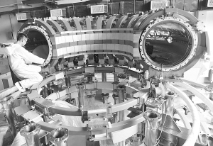 4月10日,工作人员在对“科大一环”进行安装。近日,由我国完全自行设计的首台大型反场箍缩磁约束聚变实验装置(KTX,中文简称“科大一环”),在中国科学技术大学进入最后整体安装调试阶段。据悉,该装置为科技部“国家磁约束核聚变能发展研究专项”支持的大型装置建设项目,主机总体直径8米,磁场可达7000高斯、等离子体电流达1兆安培、电子温度达600万度、放电时间达100毫秒。 新华社发