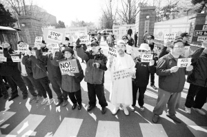 韩国民众抗议美国防长访韩及部署“萨德”导弹防御系统 4月10日,在韩国首尔,民众在国防部门前抗议。当日,民间团体在韩国国防部正门前抗议美国国防部长阿什顿·卡特的访问并强烈反对在韩部署“萨德”导弹防御系统。阿什顿·卡特于当日下午抵达韩国, 进行为期三天的访问。 新华社发