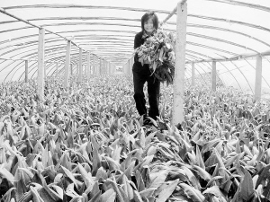 上图:昨日,商水县平店乡周王村叶菜基地一名农民工正在采收油麦菜。该县积极引导鼓励群众规模流转土地,因地制宜发展特色蔬菜产业,初步形成了“一乡一业、一村一品”的规模化生产格局。 (赵永昌 摄)