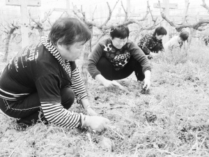 左图:昨日,商水县邓城镇许村的农民工正在生态葡萄园里除草。该镇百亩生态葡萄园吸收附近农民到葡萄园打工,长年从事看园、除草、剪枝、浇水等工作,为农民工提供了长期的就业岗位。(乔连军 摄)