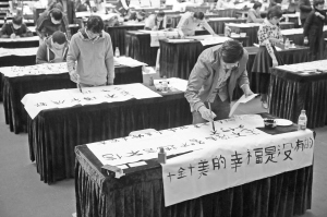 2015“金台杯”世界大学生书法大赛复赛在京举行 4月12日,参赛选手在现场书写作品。当日,由中国艺术教育促进会主办的2015“金台杯”世界大学生书法大赛复赛在北京举行。据了解,本次大赛初赛已于2014年11月完成,复赛按中国和外国两大组分别进行评选,最终在百余位参赛的选手中选出一等奖、二等奖、三等奖和优秀奖。 新华社发