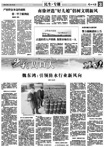 眼下,他正在做一个新型施工体系的示范、推广工作。这个施工体系简而言之,就是用新型的非固化胶体粘合防水材料,直接铺在施工面上,一改过去用喷枪粘合的方式,省工省时,防水效果更佳。“这个体系做好了,将彻底改变以往的防水工艺。”魏东鸿对此极有信心。