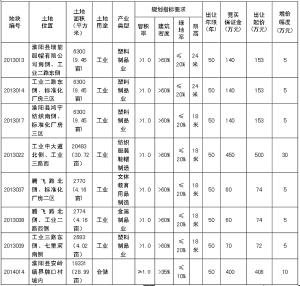 备注:1.2013013、2013014、2013017、2013022、2013037、2013038、2013039宗地位于产业集聚区内,属两层以上标准化厂房建设用地,投资强度≥3750万元/公顷。地上有部分违法建筑物,经政府办、发改委、财政局、监察局、法制办、住建局、审计局、房产办、规划办、城市综合执法局和县产业集聚区管委会集体研究,地上建筑不再作价与土地捆绑出让,由土地竞得人无偿处置地上建筑物。土地出让合同签订后,8个月内必须开工建设,工期24个月,土地成交价款需在土地出让合同签订后60日内缴清,交地时间在3个月内。