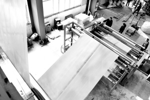 淮阳县银丰塑料有限公司流水生产线一瞥。该公司拥有大中型吹塑膜机组40多台、制袋生产线6条,并拥有完备的塑料制品化验检测设备。生产的农用塑料膜等产品畅销苏、鲁、豫、皖等地,远销美国、韩国等国家。(记者 沈湛 摄)