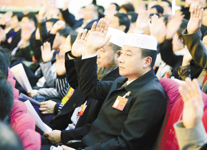举手表决的少数民族参会委员。(记者 沈湛 摄)