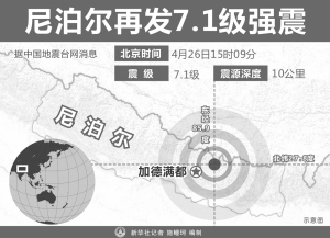 当地时间25日12时(北京时间14时)许,尼泊尔中部地区突发7.9级强烈地震(中国地震台网测定为8.1级),震中位于廓尔喀县,距首都加德满都约75公里,震源深度约20公里,属强破坏性的浅源地震。尼泊尔政府现已宣布在29个地震重灾区实施紧急状态,动员所有力量参与救援,并呼吁民众为减少后续灾害做出贡献。