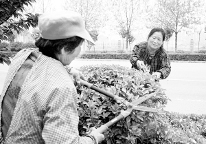 昨日,兴旺路上两名花工正在修剪道路隔离带内的花木。春暖花开正是修葺花木的最佳时机,市园林部门组织人员对市区绿化植物进行适时修整,确保环境整洁有序。 (记者 沈湛 摄)