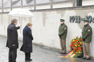 5月3日,在德国慕尼黑附近的达豪纳粹集中营纪念馆,德国总理默克尔(左二)出席达豪集中营解放70周年纪念仪式并向达豪集中营死难者敬献花圈。