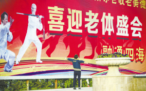 ②一名晨练者在“老健会”宣传海报前走过。