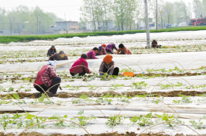 昨日,瓜农正在为西瓜苗压秧、修剪。在周营乡赵寨村,大棚种植户王中红种植的温棚覆膜西瓜,由于种植科学、品种优,所以长势喜人,预计5月中旬就能上市。(记者 韦伟 通讯员 王祥宇 幺佳 摄)
