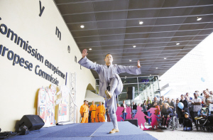 “中国角”首次现身欧盟开放日 5月9日,在比利时首都布鲁塞尔欧盟委员会大楼下,中国武僧表演功夫。当日是欧盟一年一度的开放日。因今年恰逢中欧建交40周年,中国成为欧盟成员国外唯一一个开设宣传角的国家,也是1993年欧盟举办开放日以来中国首次参加,为今年的开放日增添了不少中国元素。新华社发