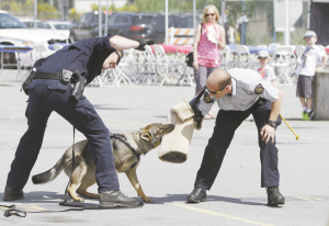 加拿大迎来全国警察周 5月9日, 在加拿大温哥华地区的素里市,警察在警局开放日活动上向民众示范警犬训练情況。为迎接一年一度的全国警察周,素里市皇家骑警总部当日举办开放日活动,向民众展示警方装备及介绍警队日常工作。新华社发