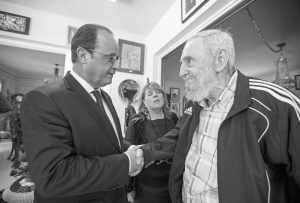 菲德尔·卡斯特罗会见奥朗德 5月11日,在古巴首都哈瓦那,古巴前领导人菲德尔·卡斯特罗(右)会见到访的法国总统奥朗德(左)。当日,法国总统奥朗德在古巴哈瓦那大学演讲。他在演讲中呼吁美国解除对古巴的经济封锁。奥朗德于10日晚抵达哈瓦那,开始对古巴进行为期3天的访问,他是冷战结束后首位访问古巴的法国国家元首。