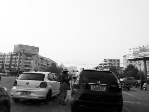 图① 市区多个路口都存在拦车行乞现象,既不文明又不安全。