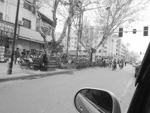 图② 五一路与交通大道口东北角人行道成了“存车场”,行人只能绕行快车道。