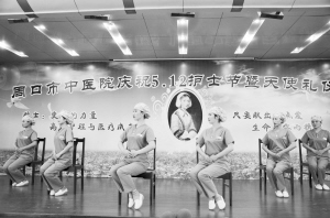 周口市中医院举行庆祝5·12国际护士节护士礼仪大赛,参赛护士们从仪容仪表、站行坐蹲姿、端治疗盘、推治疗车、持病历夹等不同侧面,对护士职业礼仪进行了精彩演绎和充分展示。图为妇产科代表队在参加比赛,她们以感人、精彩、规范的表演获得第一名。 (黎倩平 摄)
