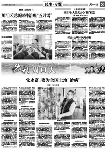 作为一名市人大代表,在今年周口市“两会”上,党永富还建议,市人大要监督农业部门采取切实有效措施,尽快推广有突出效果的肥料促进剂肥料减量技术,并加大宣传和推广的力度。多施肥多打粮食的时代已经过去,只有耕地不受污染才能多打粮食,才能可持续生产粮食。要把肥料促进剂肥料减量技术推广应用工作纳入政府重要议事日程,同时还应把它作为一项环保政策,纳入《周口市耕地质量提升规划》之中,并列入政府的财政预算。