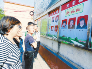 上图 昨日上午,商水县巴村镇上城村村民正在围观“好媳妇”、“好婆婆”、“好孝子”光荣榜。据了解,被评为“全国文明村”、“河南省生态文明村”的上城村,已连续3年开展“好媳妇”、“好婆婆”、“好孝子”评选活动。(乔连军 摄)
