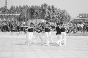 为进一步推动全民健身活动的深入开展,项城市启动了“全民健身月”活动,让市民积极投身到全民健身行列中,努力使体育锻炼经常化、个人健身生活化。图为5月18日项城市鞭陀协会的会员正在进行鞭陀健身展演。