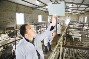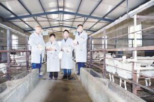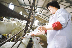 孙振伟原是当地著名的青年企业家,2008年初被西关村居民高票选举为村党支部书记,凭着对家乡的强烈责任感和保护槐山羊特色品种的使命感,孙振伟带领西关村立足本村作为槐山羊传统养殖区的优势,于2010年成立沈丘县槐山羊养殖发展有限公司,在省畜牧展交易会上,与郑州郑源公司合作,共同签约了投资6000万元建设槐山羊原种保护、繁育、深加工项目。同时与华中农大建立技术合作关系,投资800万元建成“槐山羊原种保护和繁育中心”,规划设计了化验室、消毒室、提纯复壮室、品种基因室等配套规范设施,不仅为国家级优良品种槐山羊的保种提纯工作提供了科研平台和宝贵数据库,“槐山羊提纯复壮良种繁育技术研究与应用”成果还获得2013年度周口市科技进步一等奖。经过提纯复壮,目前中心存栏特征明显的槐山羊母羊860只、种公羊36只,在此基础上,计划建成占地100亩的槐山羊养殖小区,槐山羊板皮、肉制品等深加工项目都已经开始实施。 “这些是经过第五轮提纯复壮繁育的槐山羊,目前可以说是最纯种的槐山羊了。”孙振伟指着一批刚出生的小羊向我们介绍。