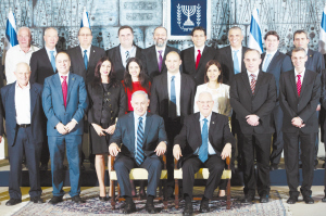 以色列新内阁亮相 5月19日,在位于耶路撒冷的以色列总统府,以色列总统里夫林(前右)、总理内塔尼亚胡(前左)与新内阁成员参加拍照仪式。新华社发