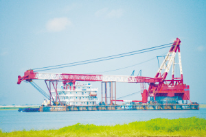 中铁大桥局千吨起重船抵达孟加拉国 这是5月20日在孟加拉国帕德玛大桥项目施工区域拍摄的中铁大桥局千吨起重船。经历一个多月的海上航行,从青岛起航的中铁大桥局“瑞航05”起重船于5月19日抵达孟加拉国帕德玛大桥施工区,为大桥建设提供重要保障。新华社发
