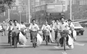 郑州:骑着单车娶新娘 5月23日,新郎带着新娘骑行在郑东新区。 当日,由郑州晚报等单位主办的“幸福相约”郑州青年集体婚礼在郑东新区举行,共有16对新人参加。婚礼上,新郎骑着自行车迎娶新娘,倡导低碳、简约婚礼。新华社记者 赵鹏 摄