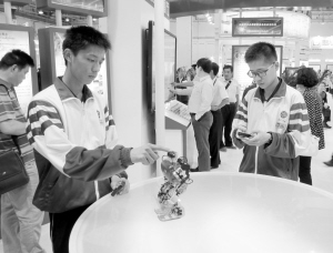 全国教育信息化应用展览在青岛举行 5月24日,两名中学生在展览上体验操作机器人。由教育部、联合国教科文组织、中国联合国教科文组织全委会主办,青岛市人民政府承办的全国教育信息化应用展览,于5月23日至25日在青岛举办。新华社记者 张旭东 摄