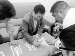张新在“出彩周口人”采访旗帜上签名留念。