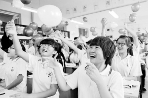 6月4日,一所中学的高三学生在教室里用放气球的方式舒缓心情。