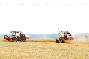 西华县田口乡组织农机合作社科学合理调配农业机械,趁天赶时帮助群众抢收小麦,确保夏粮颗粒归仓。图为该乡三夏小麦抢收现场。
