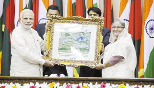 印度和孟加拉国签署多项文件加强合作 6月6日,在孟加拉国达卡举行的新闻发布会上,孟加拉国总理哈西娜(右)向印度总理莫迪赠送电站项目效果图。孟加拉国总理哈西娜6日与正在孟加拉国访问的印度总理莫迪举行会谈,两国当天签署多项文件加强合作。新华社发