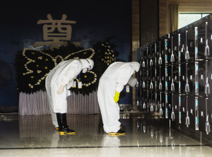 细心为逝者入殓 6月9日,在为遗体化妆前,入殓师在停灵间的冰柜前向逝者鞠躬。当日,在湖北省监利县容城殡仪馆,入殓师细心为遇难者入殓,办理善后事宜。 新华社发