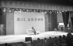 6月9日下午,由河南省教育厅、文化厅、财政厅主办的2015年“高雅艺术进校园”——省话剧艺术中心专场演出在周口职业技术学院砺德厅举行。激情的舞台对白、绚丽的歌舞场景,话剧艺术中心的演员们联袂为800余名师生献上了一场视听盛宴。(孙先锋 摄)