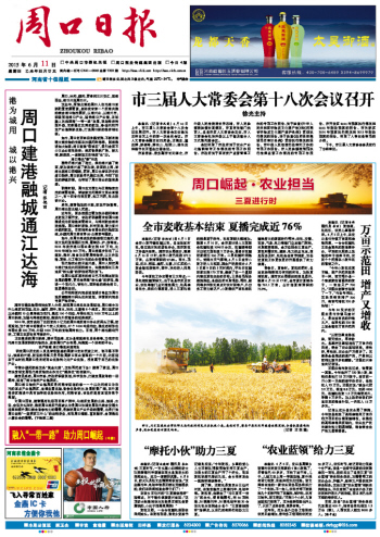 本报讯(记者 张艳丽)自6月1日全市小麦开镰收割以来,各地抢抓时机,经过连日来的紧张作业,我市麦收工作基本结束。据市农业局统计,截至6月10日17时,全市小麦已收获977.3万亩,占麦播面积的97.8%。商水、项城、沈丘、郸城、淮阳、太康、川汇区的小麦全部收获完毕,西华、扶沟进入扫尾阶段。