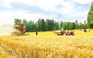 昨日,川汇区城北办事处邵火庙行政村村民正在机收小麦。麦收时节,豫东平原处处洋溢着欢歌笑语,合着机器轰鸣的声音,宛如优美的田园交响曲。 ( 记者 王 映 摄)