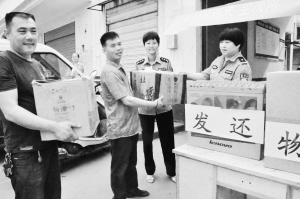 “谢谢,谢谢荷花路派出所的好民警。如果不是你们,我的损失就太大了!”6月11日下午,川汇区市民朱某从周口市公安局第四分局民警手中接过被盗的一套仿编钟和一尊明代鎏金佛像时激动得连声感谢。 (郁发顺 王海生 摄)