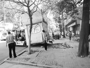 在川汇区城管局及七一路办事处城管执法人员的共同努力下,横亘在文明路人行盲道上的违章售货亭被依法折除。