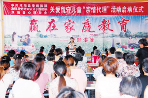 在活动现场,11名代理妈妈与留守儿童进行了认亲对接,一场《赢在家庭教育》的专题讲座也在现场开讲(如图)。此次活动旨在进一步动员社会各方力量关爱留守儿童,让责任、奉献、关心、互助的社会正能量得到进一步弘扬,让越来越多的人伸出双手,献出一片情,温暖一颗心,共同为留守儿童精神生活贡献力量。(徐常青 文/图)