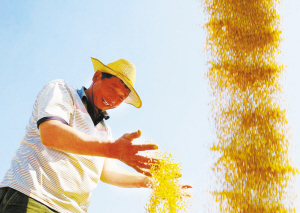 6月17日,扶沟县大李庄乡大李庄村一位农民在查看小麦颗粒情况。看到小麦颗粒饱满,他的脸上荡漾着开心的笑容。 ( 黄金峰 周运动 摄)