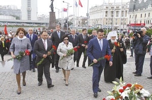 当日,俄远东各地举行了卫国战争爆发74周年纪念活动。符拉迪沃斯托克市中心广场“军人荣誉城市”纪念碑前聚集了近2000人举行纪念集会。俄远东其他城市也举行了不同形式的纪念活动。 新华社发