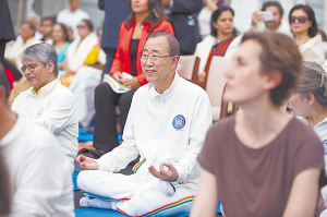 ▲6月21日,在联合国总部,联合国秘书长潘基文在体验瑜伽。