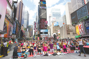 6月21日,瑜伽爱好者在美国纽约时报广场练习瑜伽。当日是“国际瑜伽日”,来自美国和世界各地的众多瑜伽爱好者在纽约时报广场进行瑜伽表演,迎接夏至到来。纽约时报广场联盟连续主办了13届瑜伽迎夏至活动。2014年12月11日,联合国正式确定每年6月21日为“国际瑜伽日”。