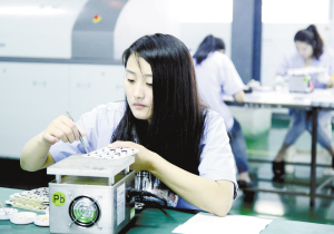 昨日,太康县产业集聚区内某企业一女工正在工作。该县以产业集聚区建设为平台,扎实开展以商招商、商会招商和产业链招商,积极承接沿海发达地区产业转移,园内现入驻项目86个,亿元以上项目75个,投产项目65个。