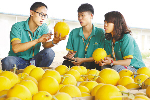扶沟县与中国农产品商务平台北京一亩田集团“联姻”,共同打造一亩田扶沟蔬菜产业带,实现了扶沟蔬菜与互联网的充分对接,拓宽了扶沟县绿色蔬菜的销售渠道,成为国内“互联网+”概念提出后实践“互联网+农业”行动计划的第一个农业大县。图为一亩田集团工作人员在曹里乡无公害蔬菜园区采集互联网上销售的精品甜瓜的基本信息。