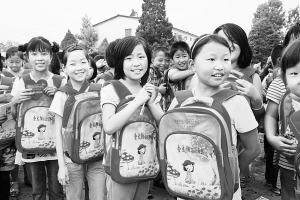 左图:6月29日,扶沟县志愿者为古城乡古北小学400名留守儿童送去书包、笔记本和圆珠笔等文具。领到了新书包,孩子们十分欣喜。