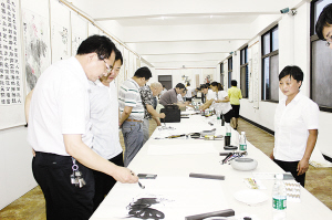 7月4日至5日,9位中原书画名家到项城市汝阳刘笔业有限公司参观,感受项城深厚的文化底蕴,并和项城市书画家进行交流,现场挥毫,留下墨宝。图为书画家们正在进行即兴创作。