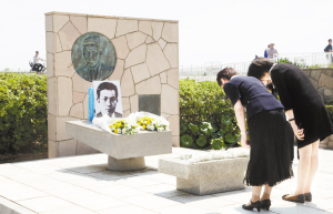 聂耳逝世80周年纪念活动在日举行 7月11日,在日本神奈川县藤泽市鹄沼海岸,参加活动的日本友好人士向聂耳纪念碑献花并鞠躬。为纪念人民作曲家聂耳逝世80周年,中国驻日本大使馆和东京都日中友协当天在位于鹄沼海岸的聂耳纪念碑前举行纪念活动。包括日本友好人士、藤泽市政府和市民代表、在日华侨华人等150人聚集在纪念碑前,共同追思聂耳。新华社发