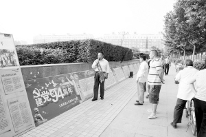7月1日至3日,太康县国土资源管理局组织开展建党94周年红色宣传活动。图为该局退休职工韩其功义务向行人讲解毛泽东、周恩来、刘少奇等老一辈无产阶级革命家的丰功伟绩,传播时代正能量。(王立平 封艳华 摄)
